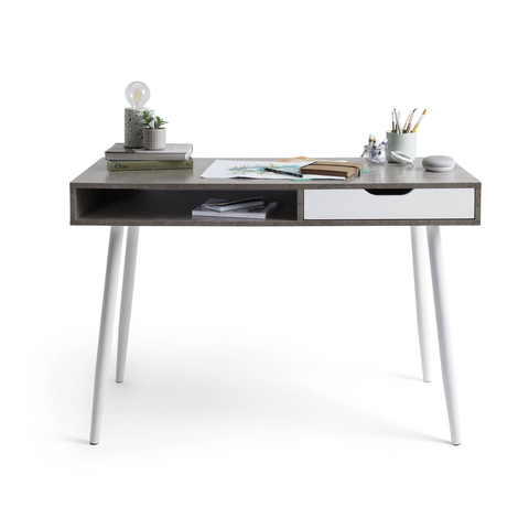 Escritorio de oficina gris de madera minimalista moderno al por mayor con cajón de patas cónicas blancas mesa de oficina en casa de almacenamiento