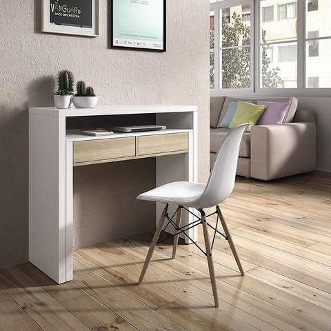 EN71 ASTMD6007 OEM Flat Pack Moderno Minimalista Ahorro de espacio Escritorio blanco y roble Consola extensible Escritorio de estudio de computadora