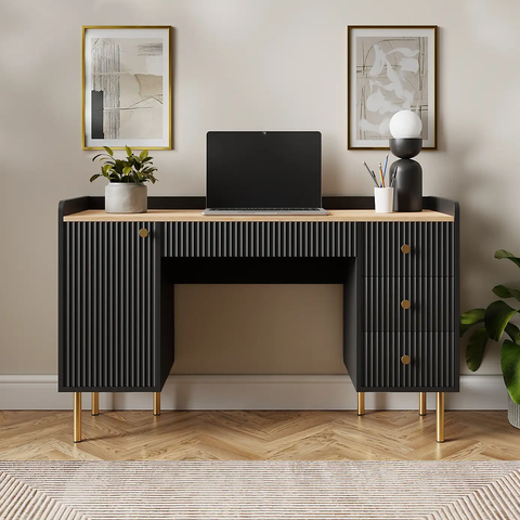 Escritorio de ordenador MDF negro de madera moderno con frentes de cajones de almacenamiento patas de metal muebles de oficina en casa