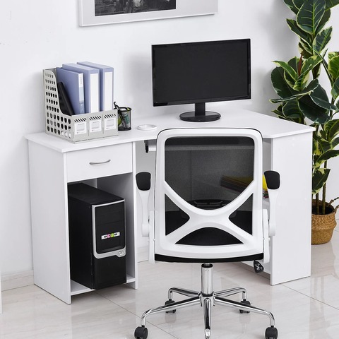 Escritorio de oficina de esquina en forma de L blanco moderno, encimera convertible de fábrica con 2 estantes, bandeja para teclado, cajón para un almacenamiento eficiente